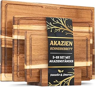 Die markante, lebhafte Maserung von Akazienholz mit ihren warmen, goldbraunen bis dunkelbraunen Tönen macht jedes Akazie Schneidebrett zu einem Unikat. Diese Schneidebretter sind nicht nur funktional, sondern auch optisch ein Highlight in jeder Küche.