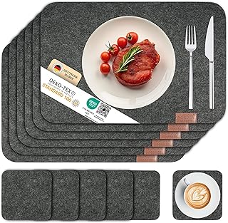 Filz bietet eine interessante Haptik und ausgezeichnete funktionale Eigenschaften. Das Material dämpft Geräusche, ist wärmeisolierend und wasserabweisend. Filz-Platzsets in geometrischen Formen wie Rechtecken oder abgerundeten Quadraten verkörpern modernes Design und sind dabei äußerst pflegeleicht.